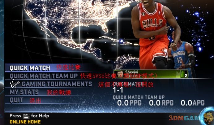 注意事项:这次联机有点缩水,不能自建房间比赛,只能通过快速比赛和世界各地玩家对战,不过大家不用担心,基本上是找和你相邻的玩家,但是网络就不确定了。所以大家碰运气吧。我打了2场,基本上能确定都是我国人。一场卡的一塌糊涂,估计是对方没有进行显卡压力测试就进入了联机,第2场不卡,可惜投篮,防守,罚篮都存在很大的延迟。不过很开心能联机成功。