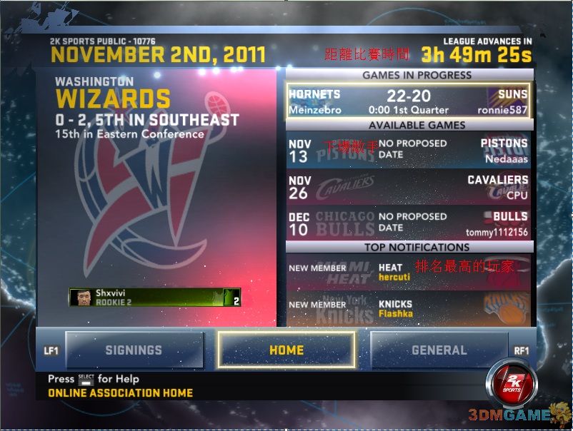 联机后续:除了正常的联机对战外,2K12还加入了一个新的线上联赛。THE ASSOCIATION:ONLINE。(线上梦幻联赛)。和以前一样,如果大家有熟悉的朋友,可以通过这个进行一起游戏。加入了受伤和士气选项(可设)。设置和梦幻联赛设置一样。最低14只球队,最高82只球队。不用担心参加人数。没有玩家的球队将有电脑自动操作。也可以进行球员交易。创建后,联赛自动开始如(图4)