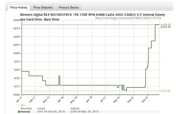 或查询西数1TB 7200转,型号RE4 WD1003FBYX。该驱动器在同一时间内从107.99美元跃升至249.99美元 。