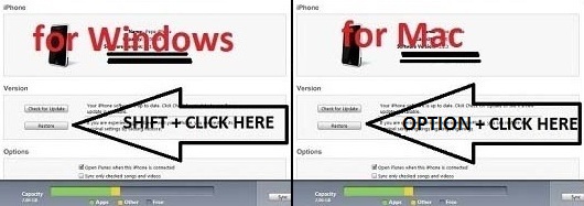3、在 itunes 里按住 shift 键,点击 Restore,然后选 iPhone3,1_4.3.3_8J2_Restore.ipsw