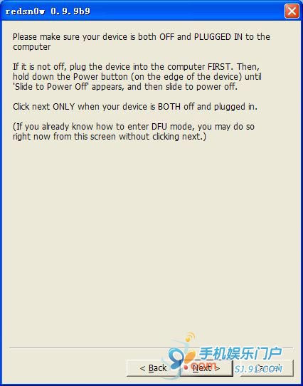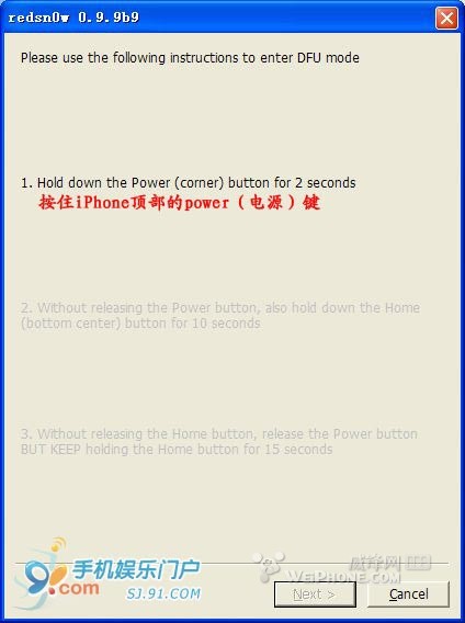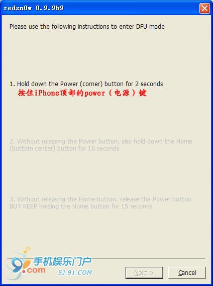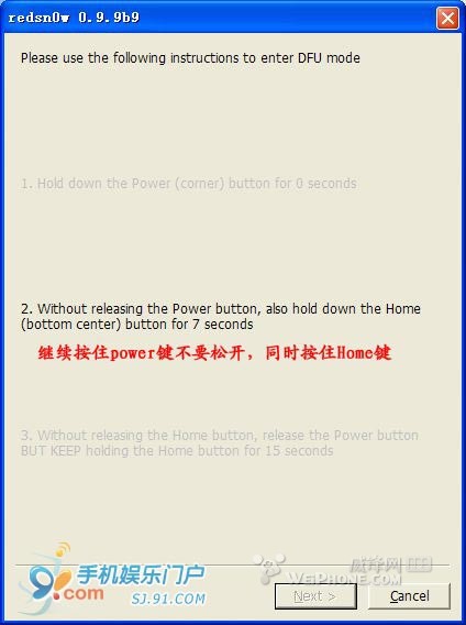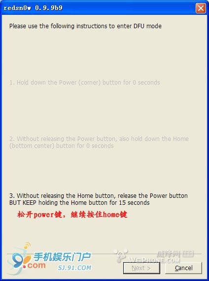 3.4 接着就进入到新手最害怕的DFU模式,其实不必紧张,按照redsnow的提示一步步进行即可,如果失败了重新来过就是了。