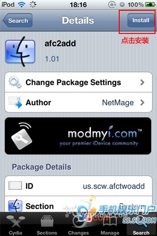越狱完成后,安装91手机助手的时候,守护程序安装失败,该怎么办?打开iPhone上的cydia,右下角有个search(搜索),输入afc2add,下载下来安装就行了,安装好补丁后iPhone会重启,这时候就需要再次重新引导。