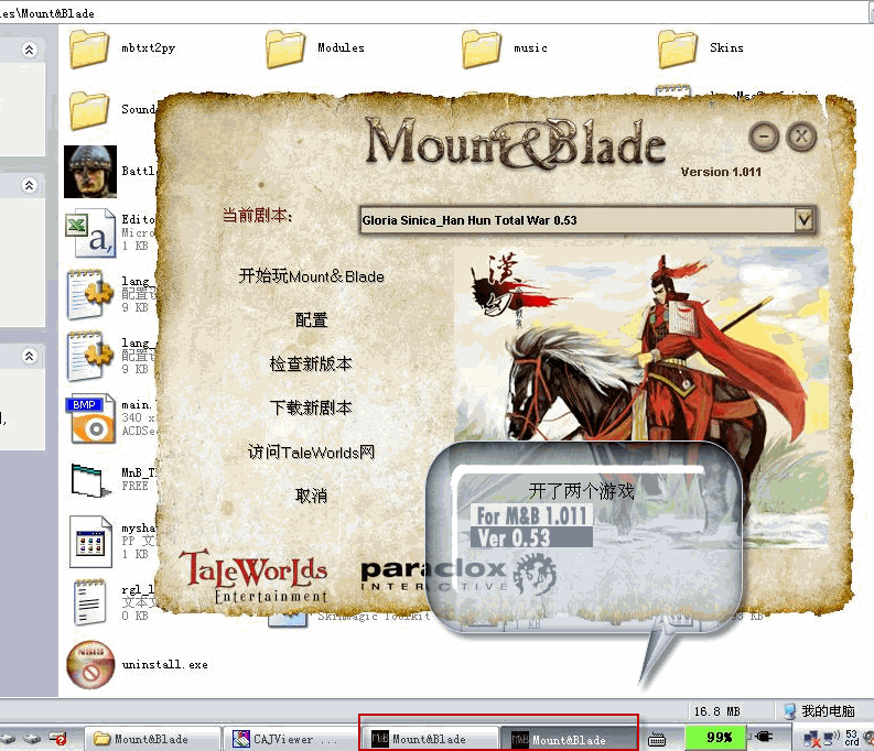 看到这张图了没有?注意最底下的任务栏。我已经开了一个M&B,我们称之为m1。m1就是我们刚才休息用的第一个骑砍主程序。然后我们休息到2000多天以后存一个档。存档后千万不要退出程序,因为此时退出,前功尽弃。存档后,按Alt+Tab切换回windows桌面。然后再开一个M&B,我们称之为M2,如上图