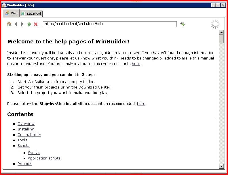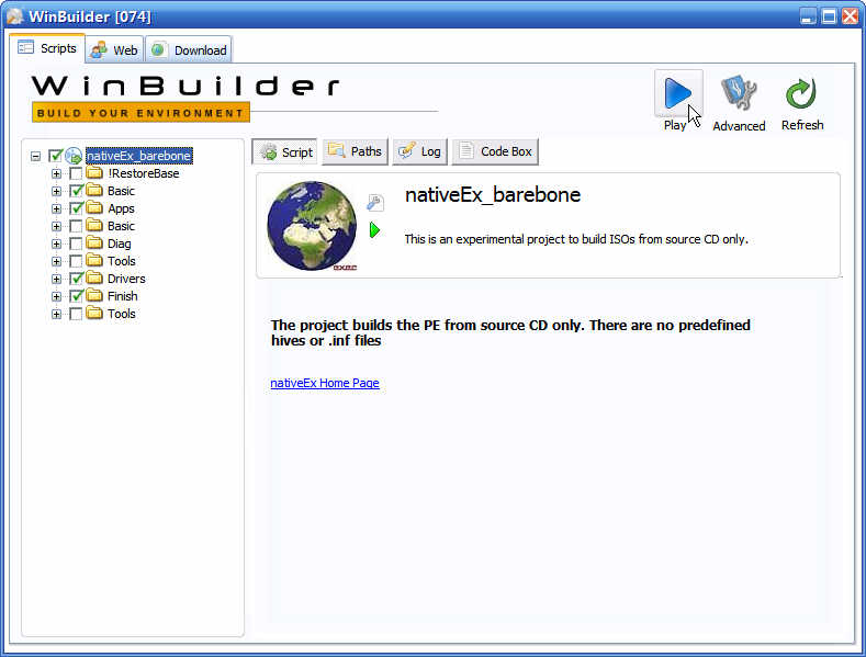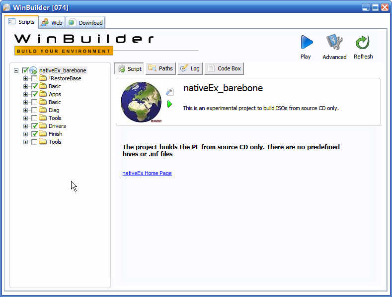 双击 "WinBuilder.exe", 出现WinBuilder 界面. WinBuilder只是一个脚本运行器, 所有制作PE的工作由脚本完成,所以必须下载脚本后才能制作PE.