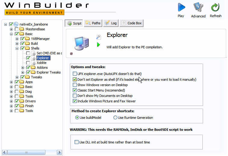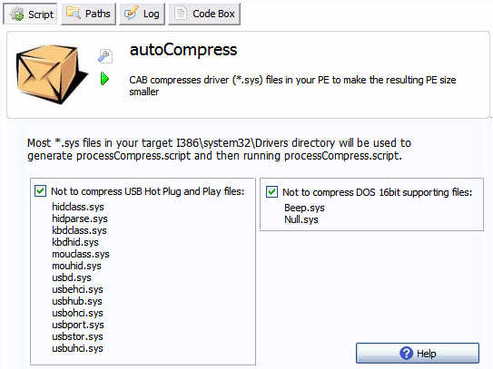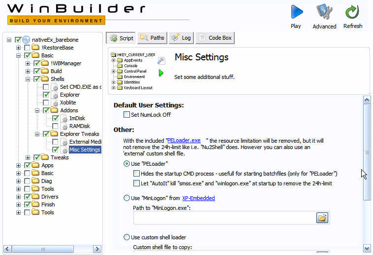 Selected- 定义在项目中有没有选择这个脚本,在生成PE时,会不会运行该脚本。键值有三种 TRUE/FALSE/NONE, NONE表示在WINBUILDER中没有复选框让你选择是否运行该脚本。