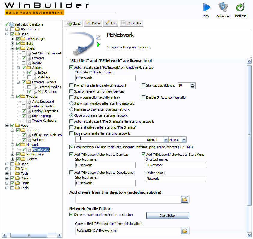 此脚本安装网络组件,及PENetwork.exe作为网络设置工具,如果想要网络支持,必须选择