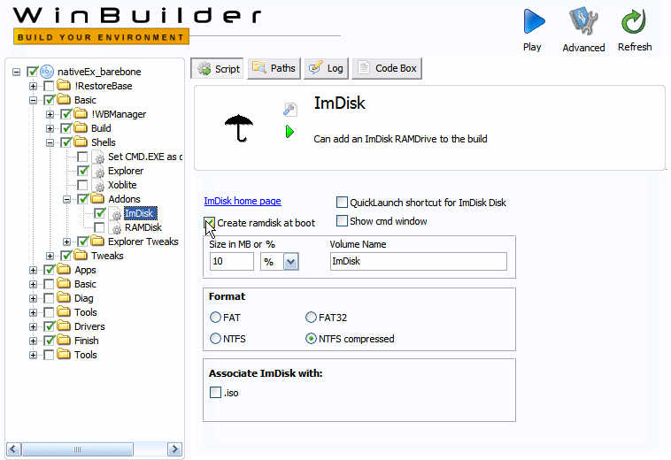 如果选择 Ram drive, 必须在Basic -> Shells -> Addons选择一种 Ram drive ( Imdisk或Ramdisk)
