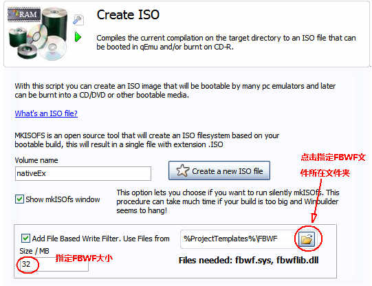 如果选择 系统盘(X:),必须在Finish -> Create Image -> Create Image 选择 Add FBWF(令x盘可写).