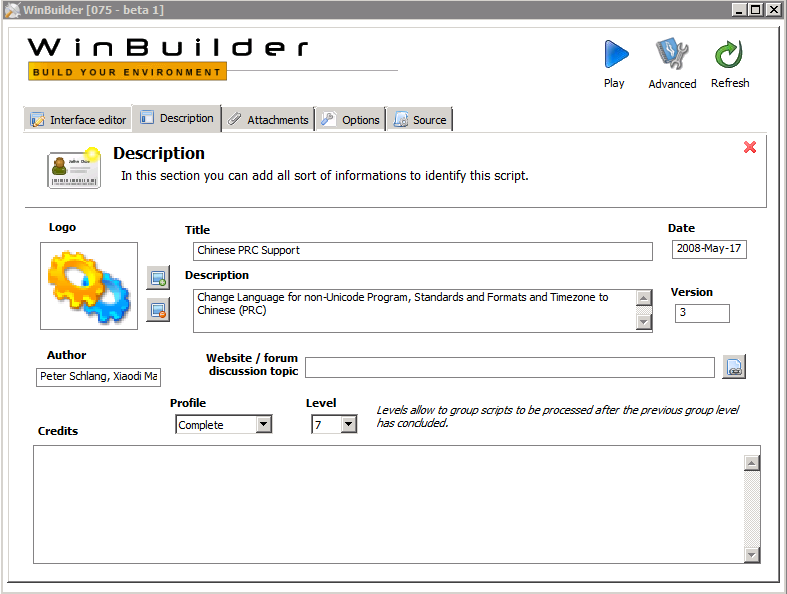 界面一节定义脚本在Winbuilder中的用户界面, 可以介绍脚本和提供用户可选择内容