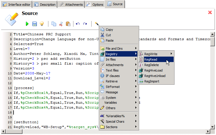 Winbuilder脚本,是以.script为后缀的纯文本文件,可以用任何文本文件编辑工具来编辑,当然,WINBUILDER也自带编辑器,并且有脚本精灵提供脚本语法帮助,但是WINBUILDER脚本编辑器的BUG也不少,需要一点时间适应。