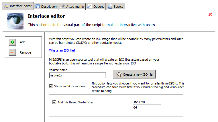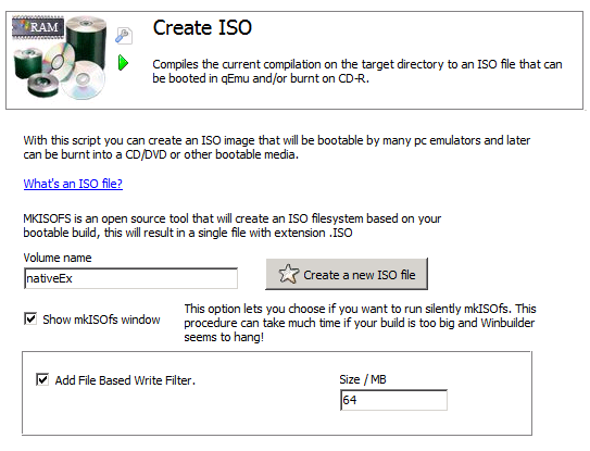 pTextLabel5="MKISOFSis an open source tool that will create an ISO filesystem based on yourbootable build, this will result in a single file with extension.ISO",1,1,15,82,411,42,8,NormalpTextBox1="Volumename",1,0,15,142,198,21,nativeEx
