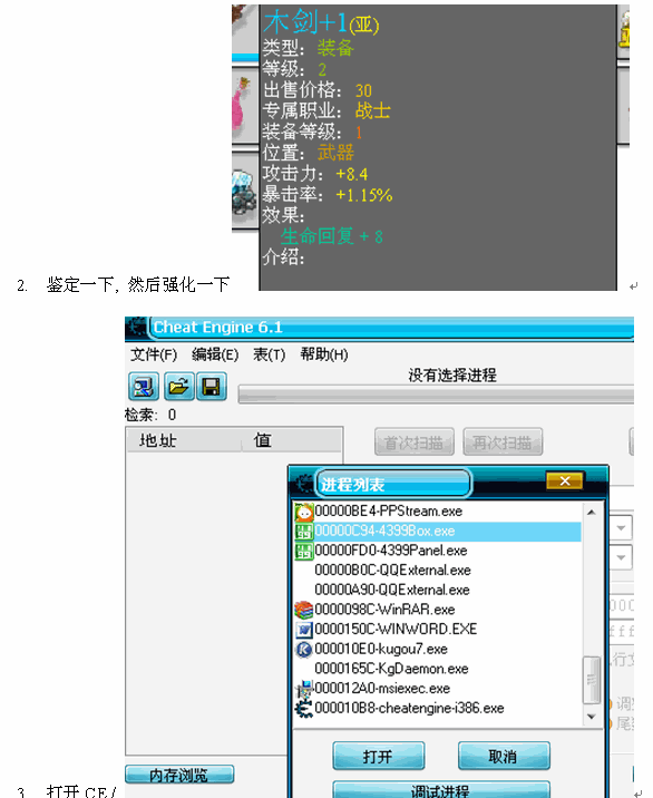 国王的勇士2.4版本武器强化 需要4399游戏盒、CE6.1.1. 打开游戏盒进入国王的勇士,然后选出你要强化的武器 – 如果你的武器已经强化到10那恐怕就不行了. 我这里就到小胖那里随便买一把新手武器.