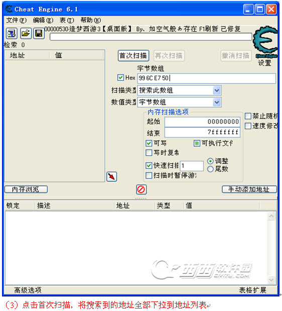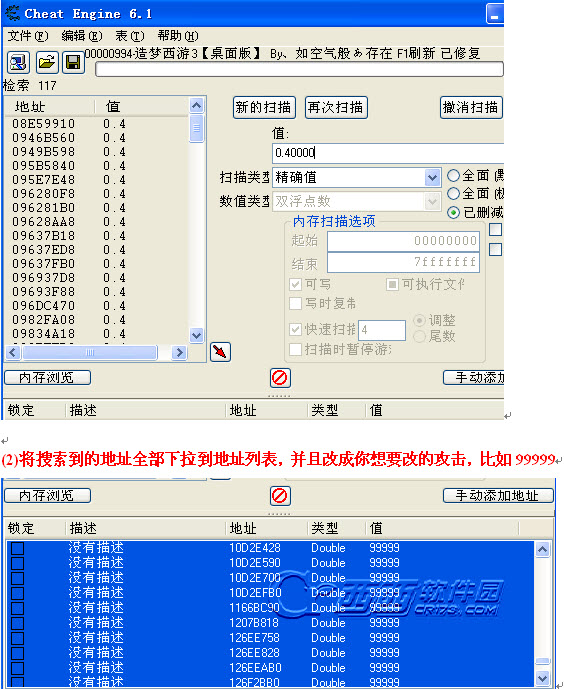 (5)打开CE6.1,将全部地址列表中的值改为刚才复制的代码,到这一步基本就完成了!