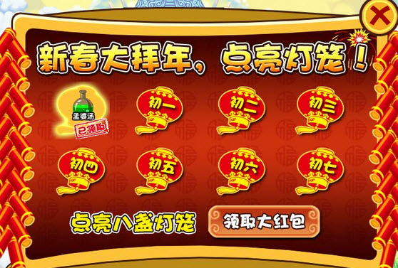 造梦西游3点灯笼活动,每天点亮送礼物哦,第一天送的是孟婆汤,真是宝贝啊~
