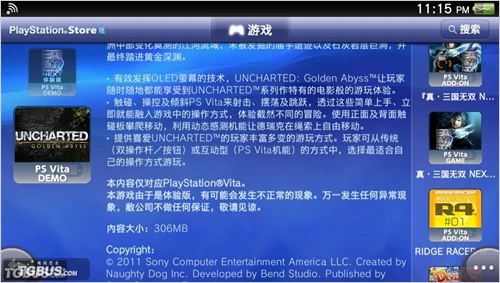 ▲以神秘海域的试玩版为例。我们需要准备的有:PSV*1、PC*1、无线路由器*1。首先,用PSV登入PS STORE,来到神海的下载页面,我们看到,神海的内容大小为306mb。