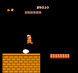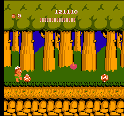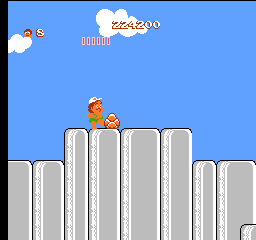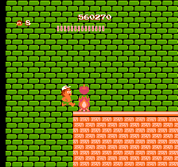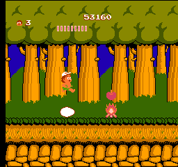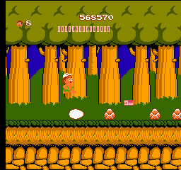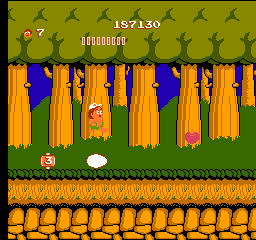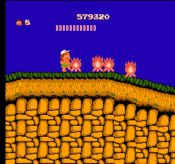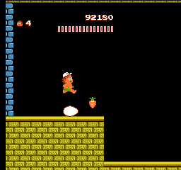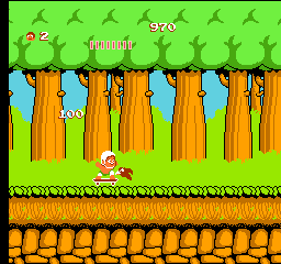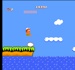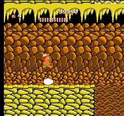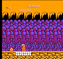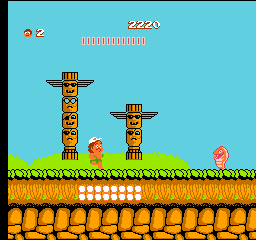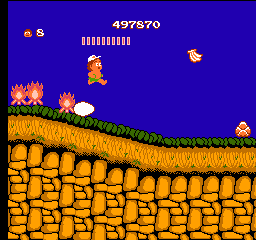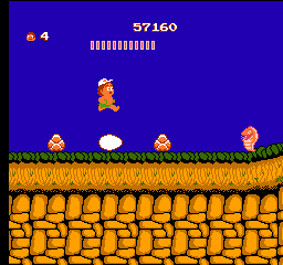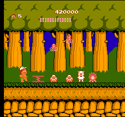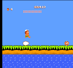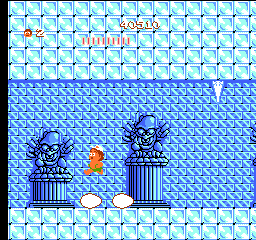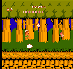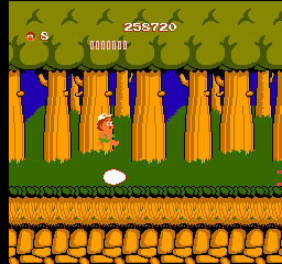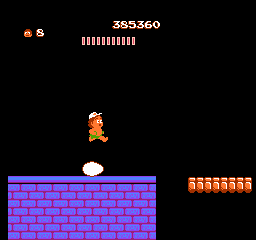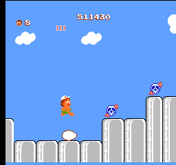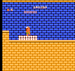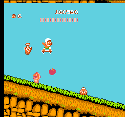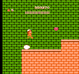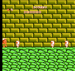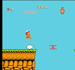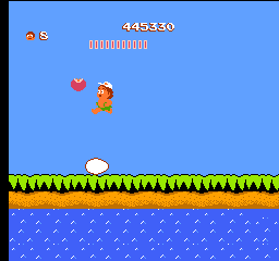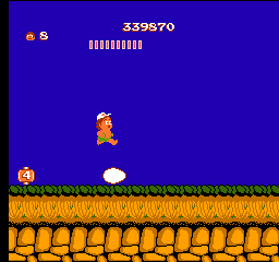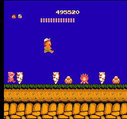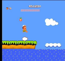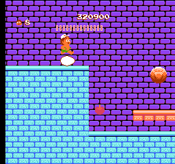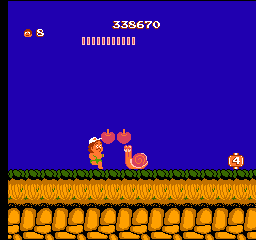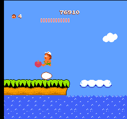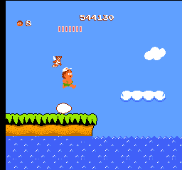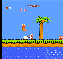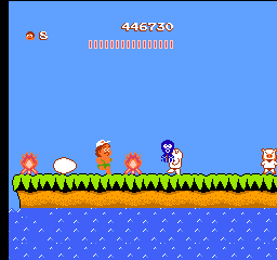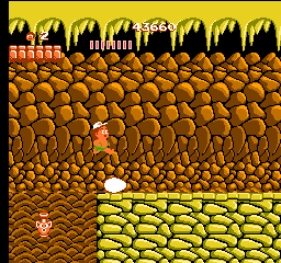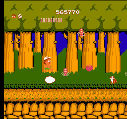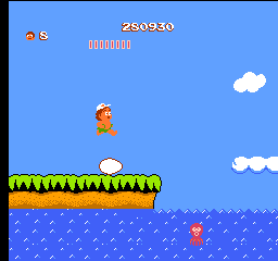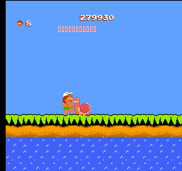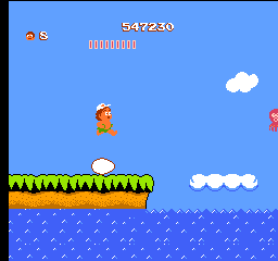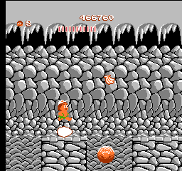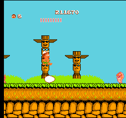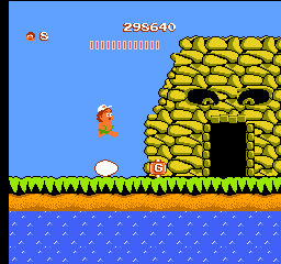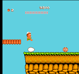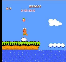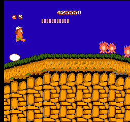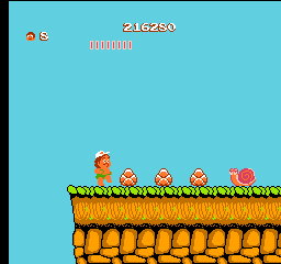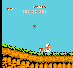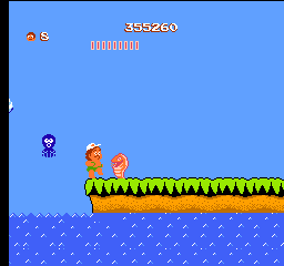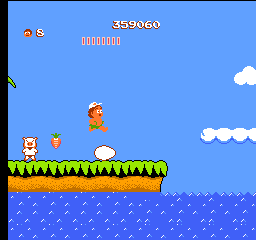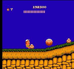 在第一区域第一小关最后崖端跳起,取得隐藏宝物-蜜蜂,以后在游戏中途死掉时,标题画面出现GAMEOVER时,按方向键任一方向和START键,便可以接关.