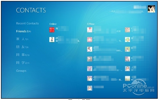 进入界面后,同样是浓浓的Metro味道。QQ将整个面板分成三块,由左到右分别是联系人分组、在线联系人(Online)和离线联系人(Offline)。当然出于精简方面的考虑,群(Groups)、最近联系人(Recent Contacts)并没有单独分组,而是合并到联系人分组之中。同时这里也没有快捷搜索栏,那么我们搜索好友又该怎么办呢?