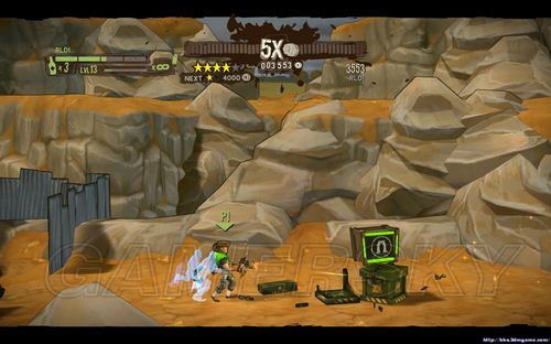 本关开始后清理一些杂兵前进(第一个桥上有零件箱),在第一个桥过后会出现2(4)个火箭机器人和一个大型蜘蛛机器人(建议首先解决火箭机器人),在第一个补给点过后站在左侧会有飞机过来轰炸右侧(下面坑里会有2个零件箱)边前进边清理杂兵