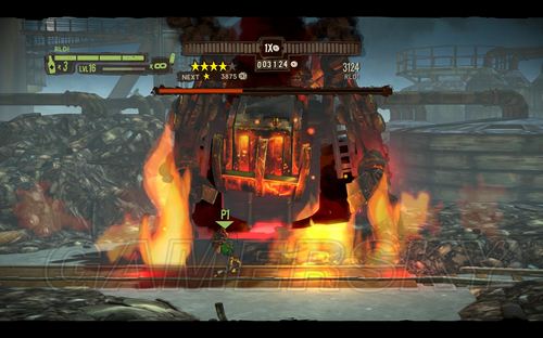 来到楼梯间后跟着楼梯继续往上前进下了楼梯之后会有火箭机器人和新敌人击杀后进入机关房前进,在路上解决一些新敌人和杂兵后来到熔炼处前进(一路上会有飞行机器人和新敌人干扰),来到管道处把墙上的炮台逐个打掉下到最下层再次来到机关房慢慢前进,进入一个房间后按下按钮开始BOSS战.BOSS没有什么特别的攻击技能(刚开始的激光不必躲站在中间的台上不动扫射BOSS即可),只需躲开它操控的台子喷射的火焰扫射它即可(BOSS操控台子是有规律的).