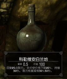 科勒维安白兰地Colovian Brandy,在梭莫大使馆任务里用到,可以把它交给Razelan用来分散注意力,你也可以给一瓶普通的酒,这样就能把这瓶稀有的酒留着收藏了,这也是唯一一瓶可以增加交易的酒类