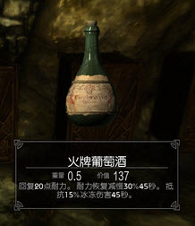 Firebrand Wine火牌葡萄酒,顾名思义,这瓶酒能给你15%的冰抗。在盗贼公会的任务中会用来贿赂Gulum-Ei,在蓝宫进门左拐可以找到一箱,可惜为了任务不能自己留着了。