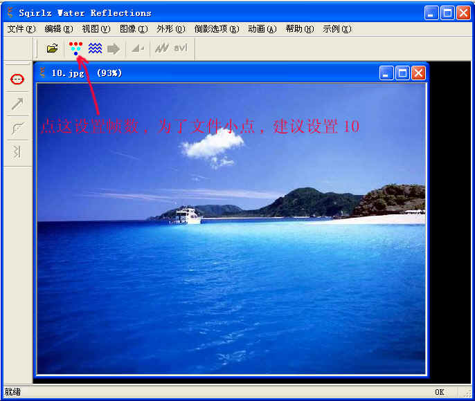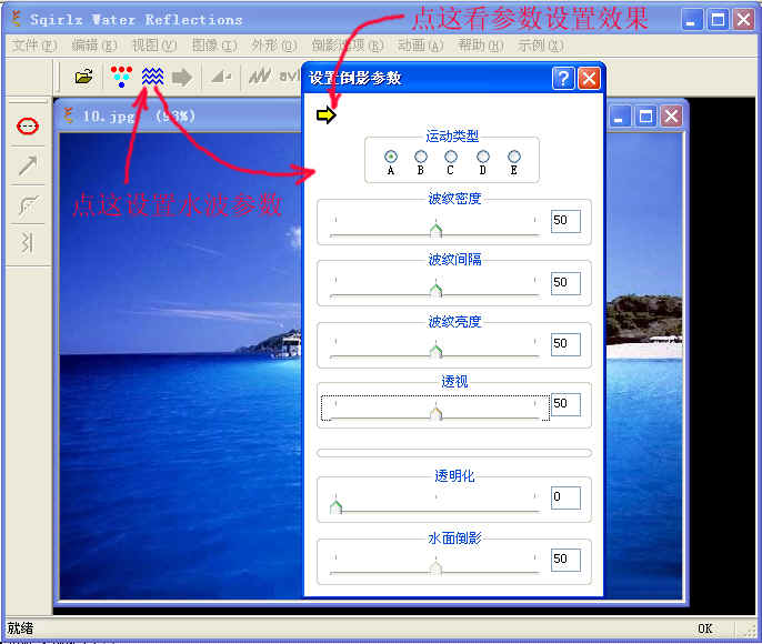 水波倒影:0--100 细致观察0和100不同百分数的效果.不细看,看不出来! 以上根据图片不同设置也不同,你可动每动其中一个参数,再点一次符号: