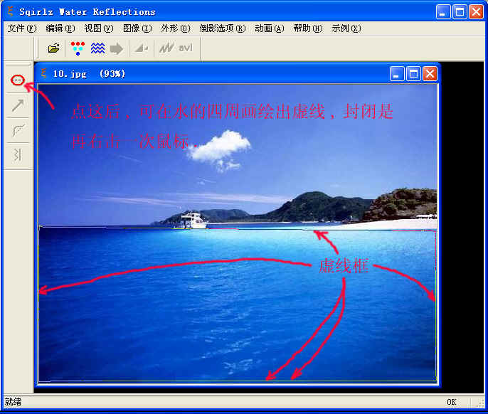 4,图片进入软件后,按图中的说明绘制虚线:注意:封闭要右击鼠标.