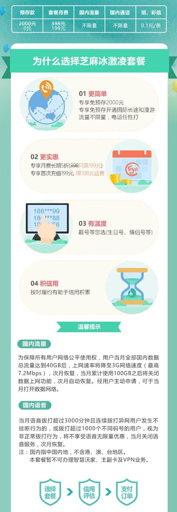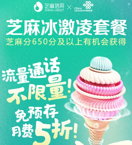 中国联通联合支付宝为高端用户推出了芝麻冰淇淋套餐,相较于之前的冰淇淋套餐最大的亮点以半价的价格体验原来398元的不限量套餐。