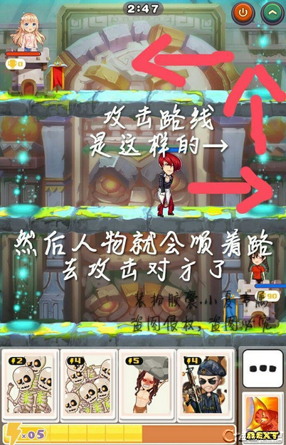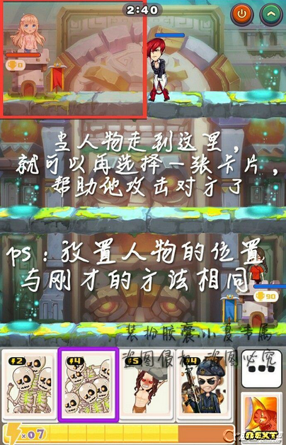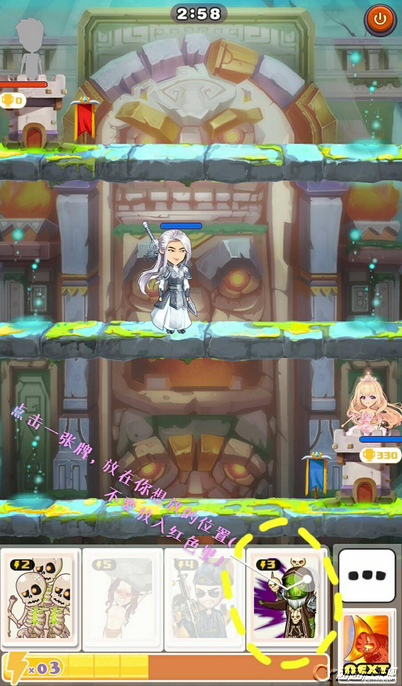 人物跑到如图所示位置时就可以在选择一张卡牌帮助他攻击塔了。