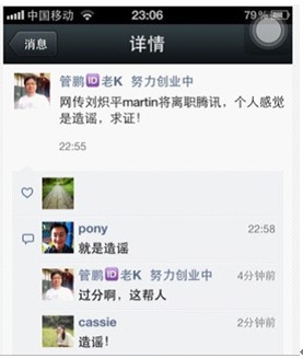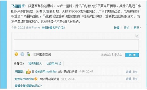 在新浪微博,知名ID炎黄网络创始人管鹏公布了他与马化腾的对话来辟谣:“腾讯躺着也中枪,先是被人造谣SOSO 要裁员,辟谣后。现在又传刘炽平要离职,要知道刘总裁可是国内最顶尖的资本运作高手,为腾讯上市立下汗马功劳,小马哥是非常低调重感情的人,从没见过这么多年开除过一起战斗的战友,造谣者请自重,请反对微博诋毁造谣的一起扩散,此事小马哥已辟谣!”