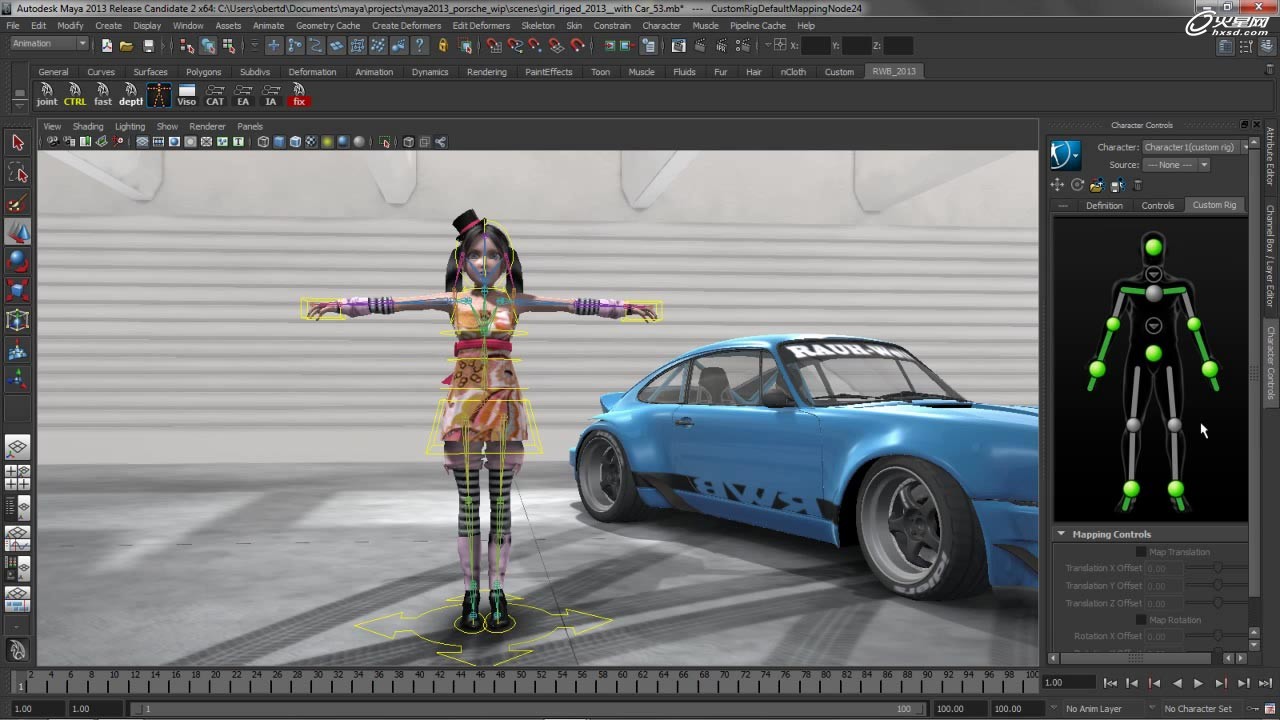 除此之外,Maya2013中的HumanIK支持对自定义的绑定进行映射。可以使用自己的绑定和控制系统,将这些控制映射到HumanIK的控制系统,然后就可以用HumanIK的功能进行工作了,如图18。