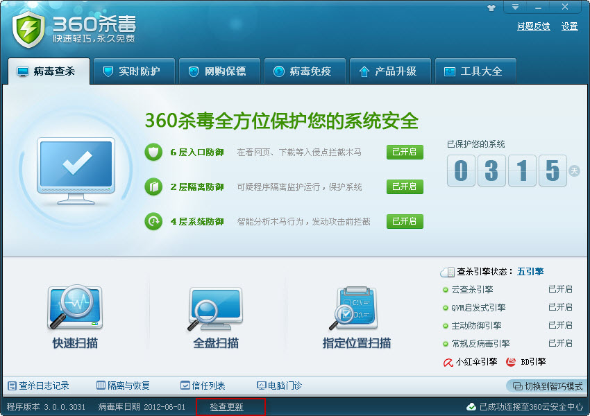 今早发现程序Bug后,360杀毒产品团队全力进行了紧急处理,目前已经发布修复程序:开启“自动升级”的用户,系统时间将自动恢复正常;如果您需要立即修复,点击360杀毒界面上的“检查更新”按钮,即可解决系统时间错误的问题。