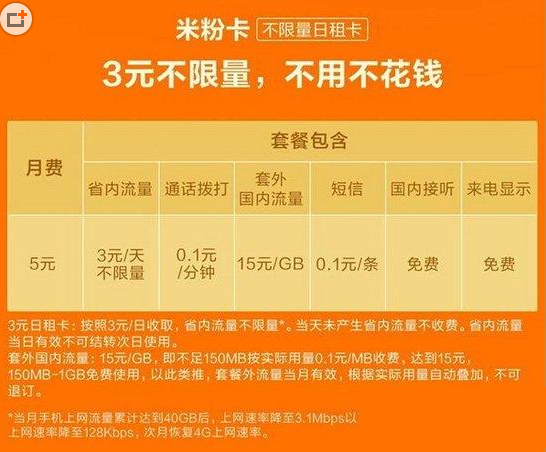 此次推出的不限量日租卡月费5元,省内流量为3元/天,当天不使用不收费。无论当天用多少流量都收费3元,通话短信费用0.1元/天,不过国内漫游流量费用为15元/GB,国内接听与来电显示免费。