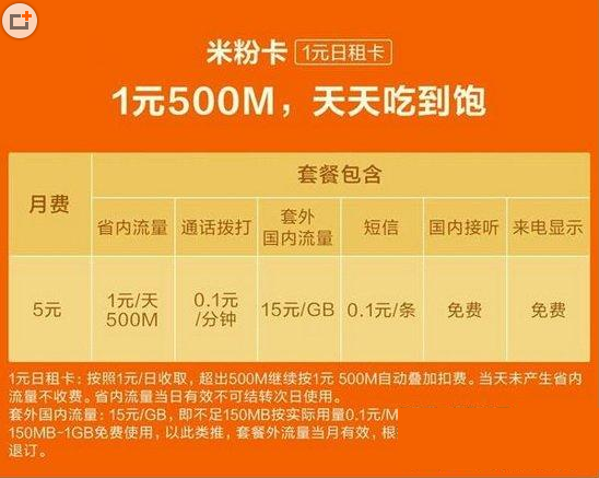 另外一张卡名为1元日租卡,月费5元,省内流量1元/天享受500MB,超过500MB依然按照1元/500MB叠加扣费,当天未产生省内流量不收费。通话短信费用0.1元/天,国内漫游流量费用为15元/GB,国内接听与来电显示免费。
