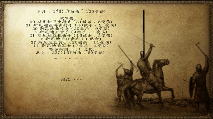 这里我把长矛手升级成 军士了, 敌人的第一波兵全灭 我这边第一波兵还剩下一半。这次可能反驳一个问题,对抗骑兵时 长矛手不一定真的比军士好用,因为细心的看战斗的话,我们可以看出长矛手被下马骑士虐得可怜..