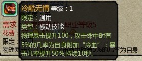 冷酷无情:刚刚也有提到过 而我们对于这个技能看重的其实不是那物爆的100提升 还是那个冷血效果 我们是靠技能吃饭的 刀卫可以等出效果抓紧读一个血饮 打出爆击高伤害 斧卫可以等出效果一个血咬回满血 当然也不是说那100的物爆没用 当然理论上是一定有用的 但脸干净与否也严重影响爆击<雪颜丶灏泣 500+爆刺客 连续3下不连不爆猴子 Ps:Boss狂暴>