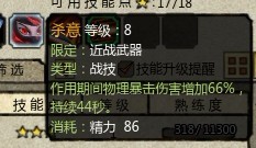 杀意:杀意的话 大家应该都了解 这是近战DPS必偷 8级物爆伤害66% 无论是BOSS狂爆 还是斧卫神技鲁莽都是有很大的作用