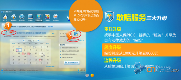 — 首创敢赔模式:金山毒霸与中国人保携手提供尽善网购保险,敢赔敢承诺,保你网购安全无忧;