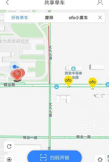 如下图显示,在新版的百度地图中,可以看到ofo小黄车、摩拜共享单车的图标选项,选择之后便可进行扫码解锁操作,无需单独安装相应的App了。