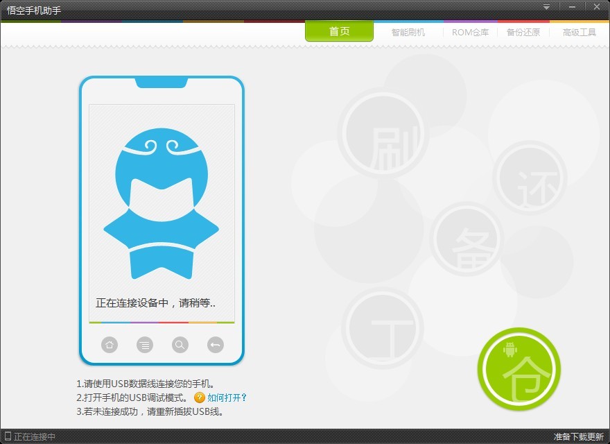 悟空手机助手(pc版)是一款安卓手机刷机的必备软件,首批支持28款热门手机的智能刷机,给您安全、便捷的刷机体验;