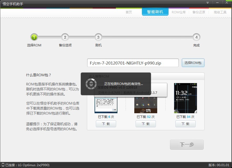 4、选择已下载的ROM,悟空手机助手会自动检测ROM包的有效性,成功后点击下一步
