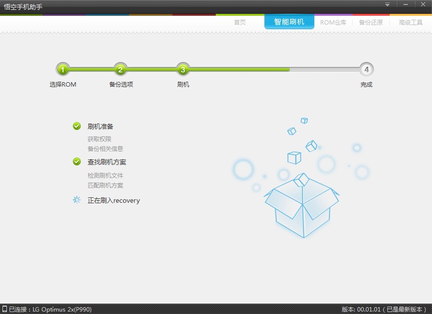7、刷机方案查找完毕,悟空手机助手将recovery和ROM包传输到手机中