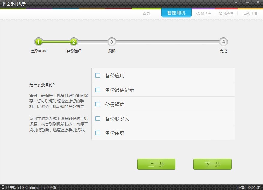 5、选择需要备份的手机数据,若不想备份可以直接点击下一步