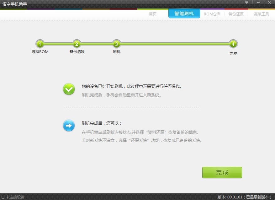 8、悟空手机助手PC端运行结束,等待手机自动进行最后操作,刷机便可完成。