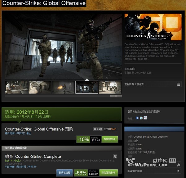 《反恐精英:全球攻势》 是Valve公司推出的新一代Counter-Strike系列游戏,官方售价为14.99美元,不过预付款的玩家,还将享受10%的折扣(13.49美元)。此外,现在预购的用户还可在8月14日抢先体验Beta公测版,而最终版将在美国时间8月21正式上线。目前暂不清楚Beta版中包括什么内容,不过游戏的最终版本将拥有超过45款武器,新的游戏模式,新的视觉效果和超过165的Steam成就。