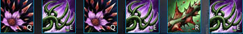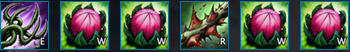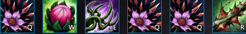 前期主升Q,优点是伤害比较高,且CD较短,适合对线磨血,对W种下种子使用Q会变出一只豌豆,对对面的僵尸开炮,好吧,这是个玩笑。副升E,E可以捆绑敌人,对于gank和逃跑都很有用,W是个接近无消耗的技能,你可以用来放视野,多利用它。