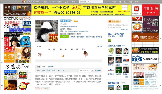 在新浪微博还在苦苦探索盈利的时候,有网友@天才小熊猫做了一件颇有创意的事,他把微博两边空白处分成1万个小方格,然后出租,租金是每个格子20元,有效期是一年。