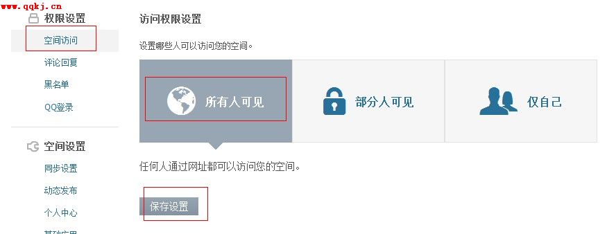 然后点空间访问,再点所有人可见,最后点保存设置,如下图: