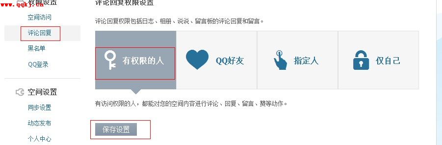 操作也是先进入个人中心,然后点空间设置,再点评论回复>有权限的人>保存设置,如下图: