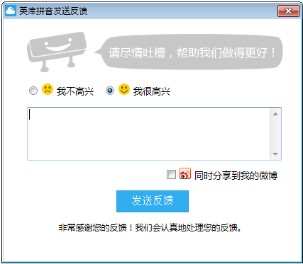 在打开的发送反馈页面告诉我们,您喜不喜欢我们的输入法,为什么?还可以把您的意见分享到微博哦!